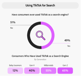 Adobe recently published research looking into how consumers are using TikTok as a search engine with nearly 49% of users having done so at least once. And it’ll be no surprise that 65% of these users are Gen Z, searching topics such as new recipes, DIY tips, beauty advice or workout routines.
